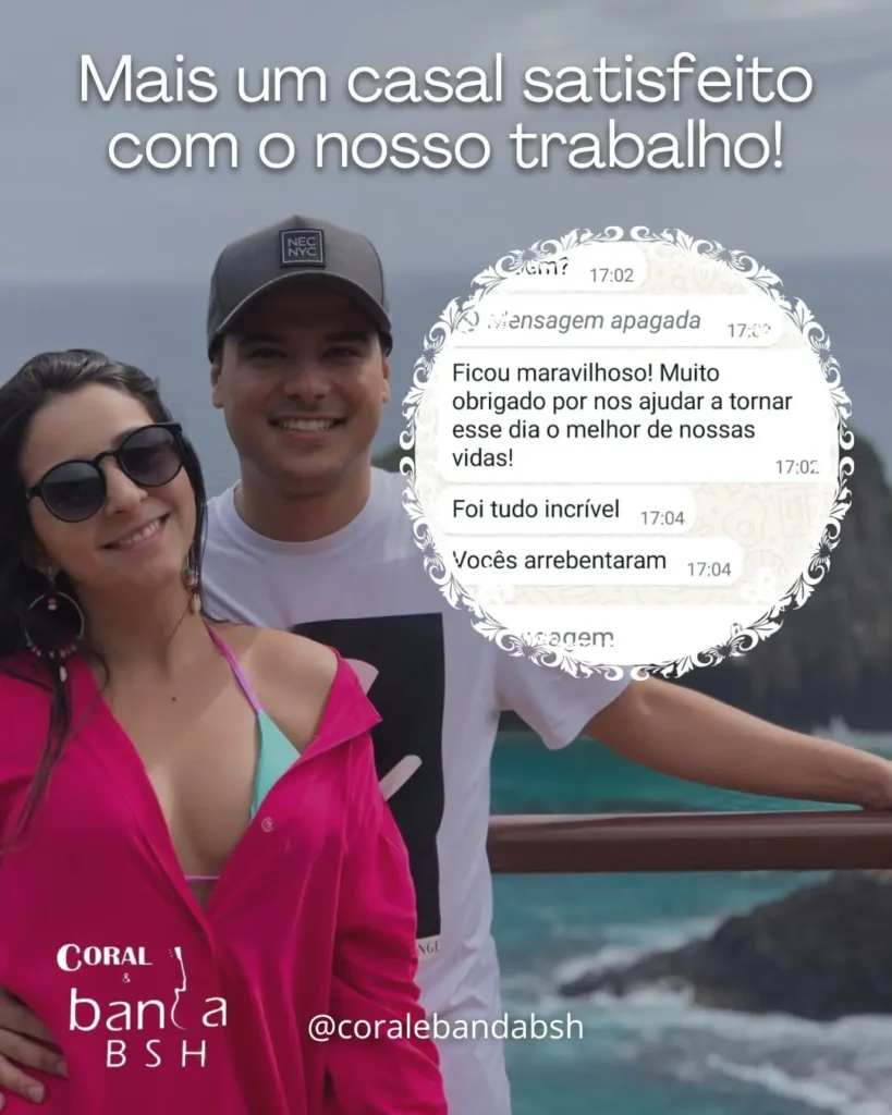 Coral e banda BSH Contratei o serviço desse fornecedor que foi simplesmente maravilhoso! Fizeram minha cerimônia ficar ainda mais linda com o profissionalismo deles. Sem falar do pré e pós atendimento que é muito bom. Fabi sempre de prontidão para nos atender. Muito obrigada ????